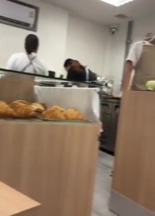 interior of a cafe or bakery decorated for Halloween. Initially, the camera focuses on a display case filled with croissants. A small, orange, stylized dog figure sits on a nearby table, next to a green drink. The camera then pans to the right, revealing two employees behind the counter. One employee, with long brown hair, is bent over working, and a male employee in an apron stands to the side, adjusting his hair. The camera continues to pan further right, showing coffee cups stacked near a coffee machine. Three jack-o'-lanterns of varying sizes are visible next to the machine. The final shot shows two fabric ghost figures, one wearing a witch's hat, positioned behind the jack-o'-lanterns, completing the Halloween scene. The cafe is well-lit with white walls, and Halloween decorations are hung on the walls.