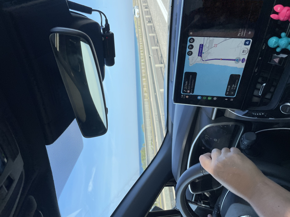 The image captures an interior view from a vehicle in motion on a multi-lane coastal highway in Tirat HaCarmel, Israel. The perspective is forward through the windshield, revealing the Mediterranean Sea bordering the highway under a clear blue sky. The driver's hands, with light skin tone, are positioned on a black steering wheel on the left side of the frame. The digital instrument cluster visible through the steering wheel indicates a speed of '97' km/h. To the right of the steering wheel, a large, vertically oriented touchscreen infotainment system displays a navigation application, likely depicting a route along the coastline. The navigation screen shows '2.3 km' to an upcoming point, an estimated travel time of '17 min,' and a current speed of '91' km/h. Hebrew text is present on the screen, including "דרך מצפון דרום" (North-South Road). Below the infotainment screen, two small, plastic figures—one light blue and one pink—are attached to the dashboard. A rearview mirror is mounted centrally on the windshield, and a compact, black dashcam is affixed directly below it, connected by visible wiring. On the highway ahead, a white sedan is visible in the distance, traveling in the same direction. The highway itself features multiple lanes separated by concrete barriers and guardrails from the coastal area.