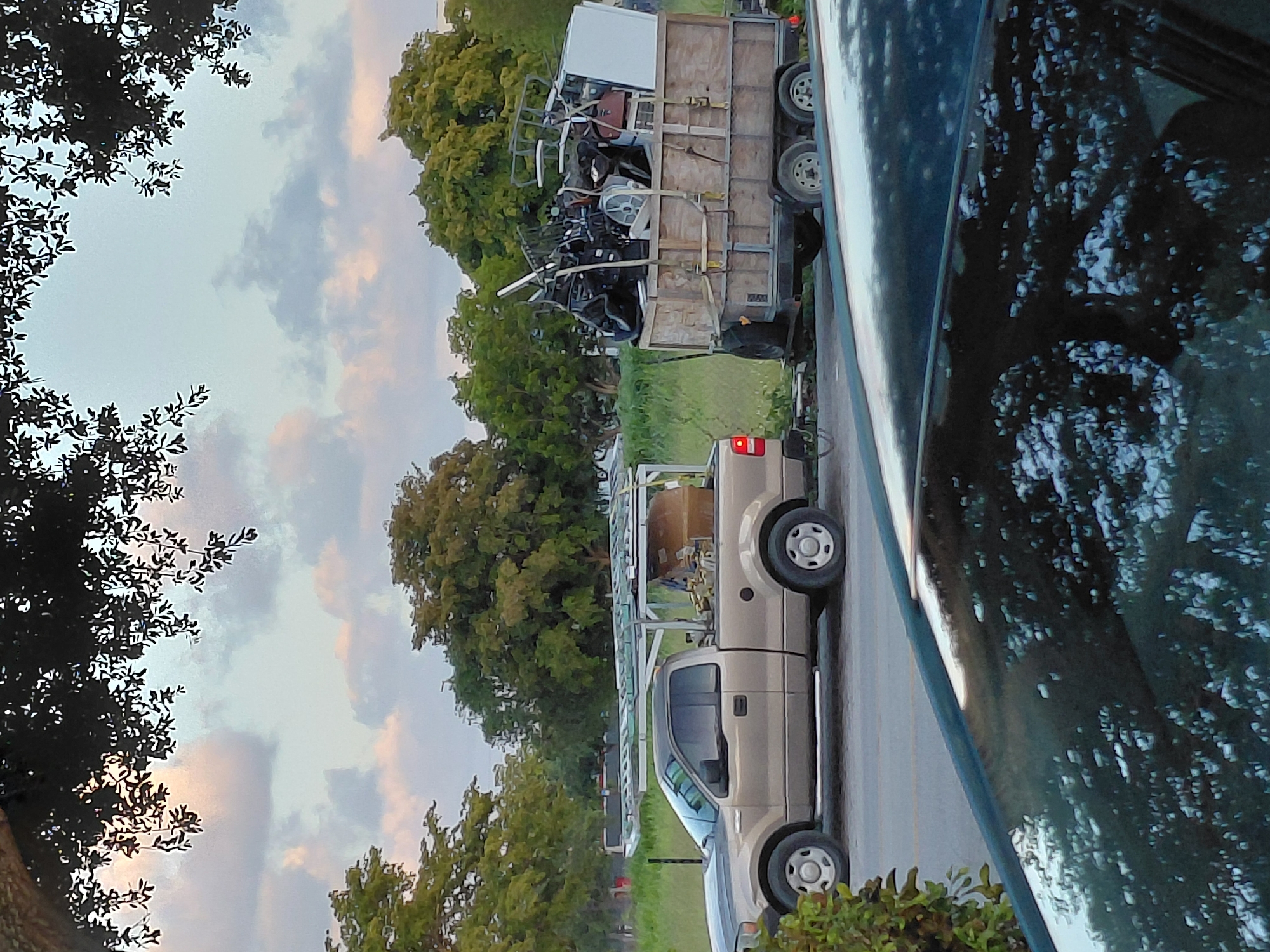 tan pickup truck with a ladder rack, pulling a trailer loaded with scrap metal. The vehicles are parked on a street lined with trees, possibly in a residential or commercial area. Part of another car is visible in the foreground, with reflections in the glass. The sky is cloudy. The location is not identifiable as being in Miami, United States of America.