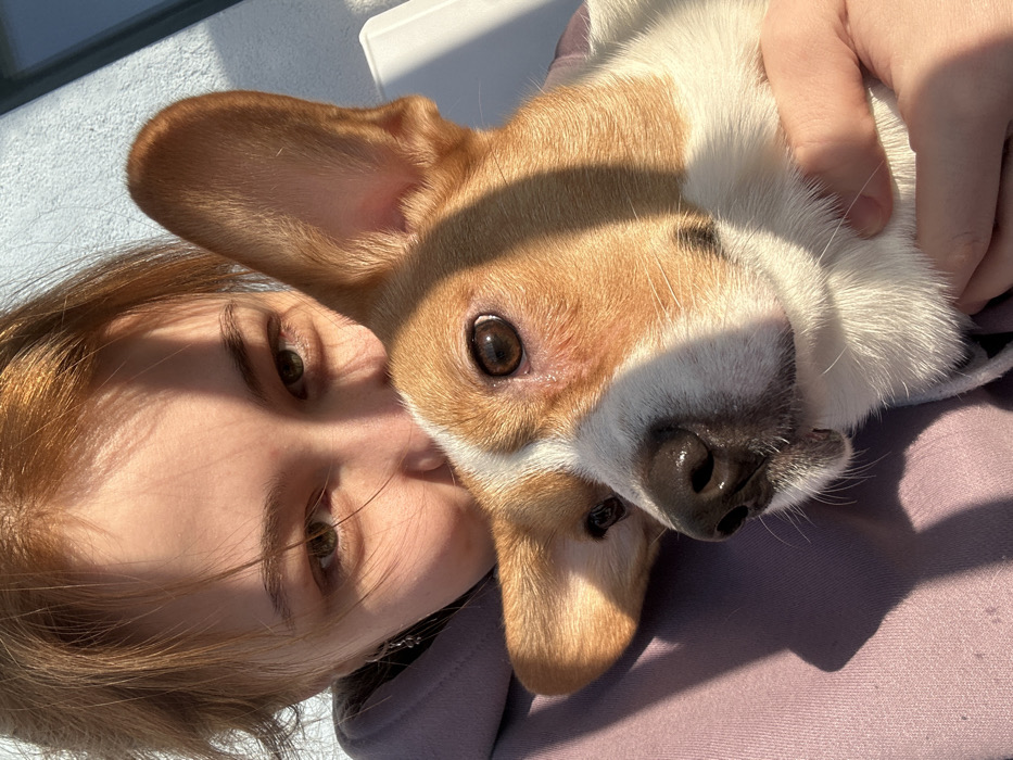 A close-up image depicts an individual holding a dog outdoors in Kommunarka, Russia, under direct sunlight. The upper portion of a person's face, featuring reddish-brown hair and light-colored eyes, is visible at the top of the frame, partially obscured by shadows. The person wears a light purple hoodie, and their right hand is visible supporting the dog. The prominent subject is a dog, likely a Corgi, with reddish-brown and white fur, large upright ears, and a moist black nose, looking slightly to the right of the camera. Strong sunlight casts distinct shadows across both the person and the dog. In the background, a light-colored, textured building wall and a dark window frame are visible.