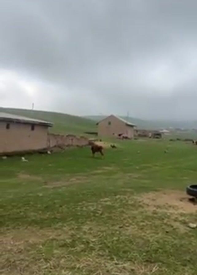 rural scene with a green field, a few buildings, and livestock under a cloudy sky. A brown and white cow is grazing in the field, and there are chickens scattered around. There are houses in the background, and mountains can be seen in the distance, partially obscured by clouds. In the foreground, there is a black tire filled with water. The camera pans slightly to show more of the surrounding landscape.