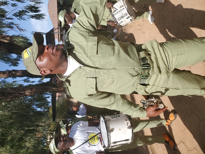 The image captures an outdoor gathering in Jos, Nigeria, under bright daylight. A central male figure, of medium-dark complexion and robust build, is depicted wearing a light olive-green uniform comprising a long-sleeved shirt with two button-flap chest pockets, matching trousers, and a cap featuring a yellow and green stripe on the side. A white undershirt is visible at his collar, and he wears a dark green belt with a distinctive emblem buckle. He holds a silver-colored bugle-like instrument in his right hand, pointed downwards, and looks towards his right (viewer's left) with a focused expression. To the left and slightly behind the central figure, another male individual with a medium complexion is seen wearing a white short-sleeved t-shirt with a yellow circular logo that partially reads "NYC TOWN BAN..." and a light green cap. He carries a white drum suspended by a black strap across his shoulder and wears orange shoes. He is smiling and looking towards the left. To the right of the central figure, another person, largely obscured, is visible holding a white drum on which the text "NATIONAL YOUTH" is legible. This individual wears white sneakers. Multiple other individuals, predominantly in similar light olive-green uniforms and caps, are present in the background, including one person wearing sunglasses behind the central figure. The ground surface consists of reddish-brown soil mixed with light-colored interlocking paving stones, casting sharp, distinct shadows from the subjects, indicative of direct overhead sunlight. Several trees with dark trunks and green foliage are visible in the background, along with indistinct building structures. The sky above is clear blue.