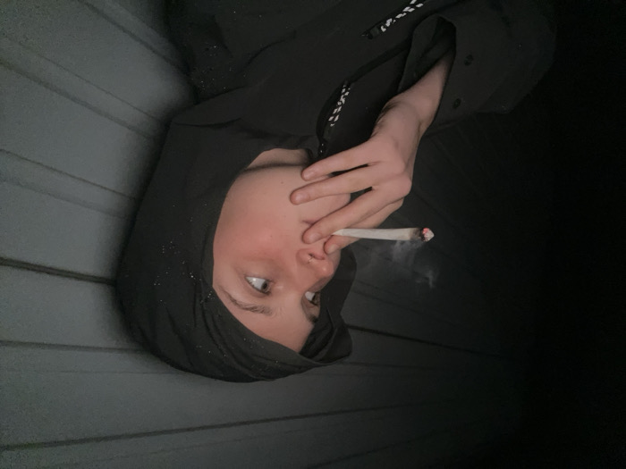 The image displays a young individual with fair skin, light-colored eyes, and a nose piercing on their left nostril, captured in a close-up, slightly upward-angled shot. They are wearing a black hooded jacket with the hood pulled up. The individual holds a lit, hand-rolled cigarette, emitting smoke, between the thumb and index finger of their right hand, positioned near their mouth. Their gaze is directed upwards and to the left of the frame. The background on the left is dark and indistinct, while the right side reveals a dark grey, horizontally corrugated or paneled wall. Small reflective specks are visible on the hood and the wall, consistent with moisture or dust. The scene is dimly lit, with the primary light source illuminating the right side of the subject's face and the adjacent wall. The specific location within Vancouver, Canada, is not discernible from the visual evidence presented in the image.