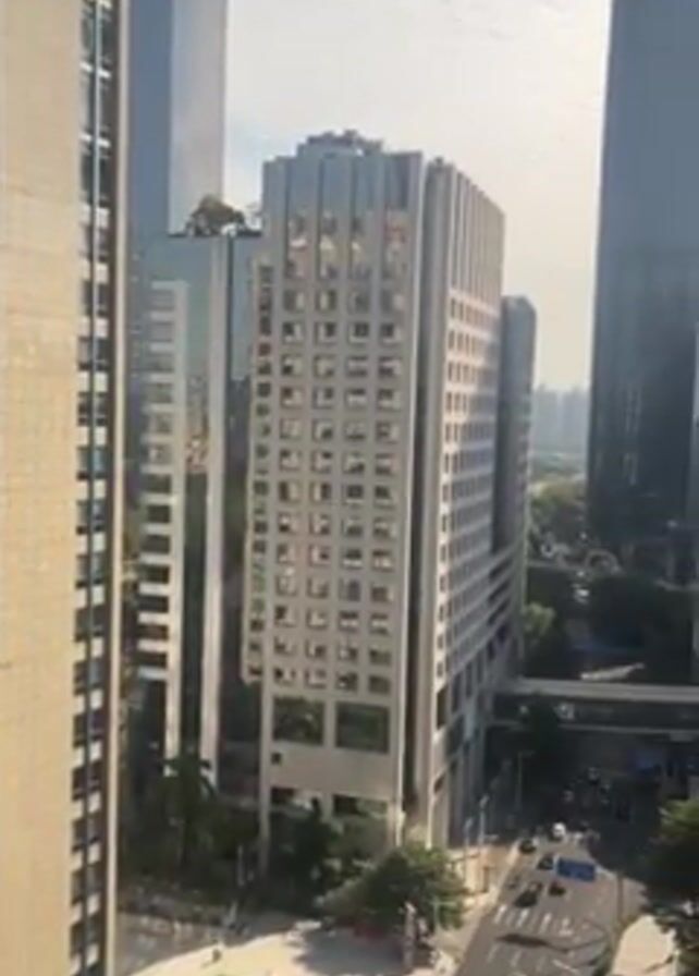 high-angle view of a modern cityscape, likely taken from a skyscraper window