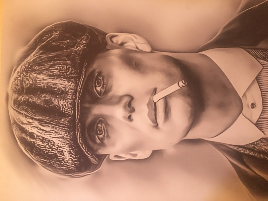 A sepia-toned image depicts a man with a sharp gaze. He wears a newsboy cap with intricate detailing and a collared shirt with subtle stripes. A cigarette is held casually in his mouth, adding to his confident demeanor. The style and attire suggest a vintage or period setting, possibly the early 20th century. The overall artistic rendering conveys a sense of both toughness and sophistication.