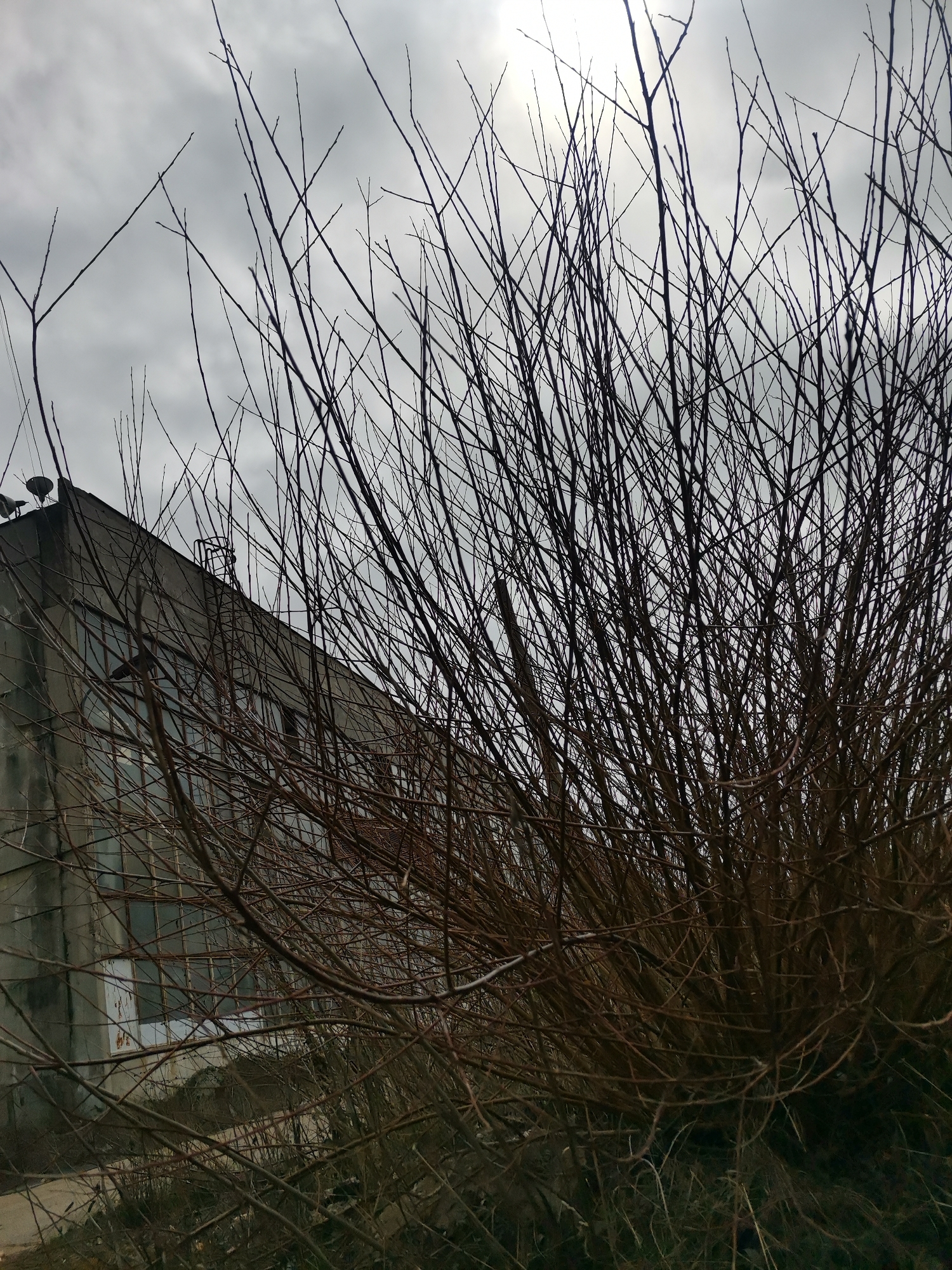 A low-angle shot shows a dense tangle of brown, bare branches in the foreground. Behind the branches is a two-story concrete building with a flat roof. The building's exterior appears weathered and gray. A grid-like pattern of windows is visible on the building's facade. The sky above is overcast, with a pale, diffused light filtering through the clouds. The location is presumably Zhivkovo, Bulgaria.