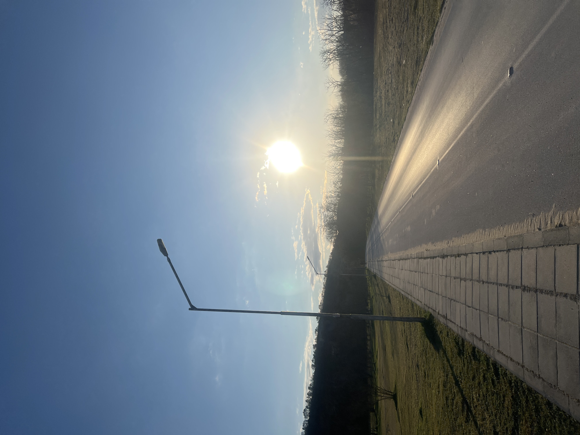 The image depicts a road with a sidewalk, flanked by grass and trees. The sun is shining brightly, creating a glare on the road. A street lamp stands tall on the left side of the road. The exact location in Varna, Bulgaria, cannot be determined from the image alone. There are no people visible.