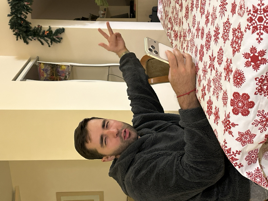 - "A man in a gray fleece jacket poses with a peace sign and a phone in front of a table covered with a snowflake-patterned tablecloth" by FM-9wAJk1, licensed under CC BY 4.0