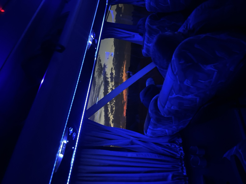 The scene inside a moving vehicle, possibly a bus or train, is bathed in blue light. A window displays an atmospheric view of a sunset or sunrise with orange and grey clouds. Interior elements like seats with patterned fabric, window curtains, and a metal structure are visible. A strip of LED lights illuminates the vehicle's interior, casting a strong blue hue on everything. The perspective is slightly tilted, adding a dynamic feel.