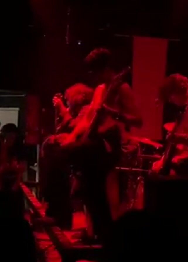 A low-angle view shows a band performing live on a stage bathed in red light