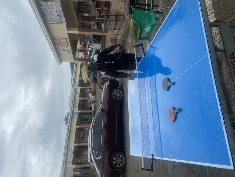 An outdoor scene depicts a man standing near a blue ping-pong table in a commercial area of Unknown, Nigeria