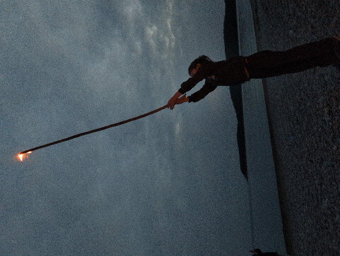 The image captures an outdoor scene at dusk or early night on a pebbled beach in Prijevor, Montenegro. In the foreground, a dark-clothed individual stands on the multi-toned pebbled ground, facing slightly away from the camera, with their arms extended directly upwards. They firmly grasp a long, slender, dark pole, held vertically, which culminates in a small, bright orange flame at its tip, illuminating the immediate area around the pole's end. A second, indistinct dark silhouette of another person is partially visible on the far left edge of the frame. The midground features a calm expanse of dark water, likely the sea or a large lake. In the background, dark, undulating landmasses are silhouetted against a dark, overcast, and grainy sky, indicative of low-light conditions.