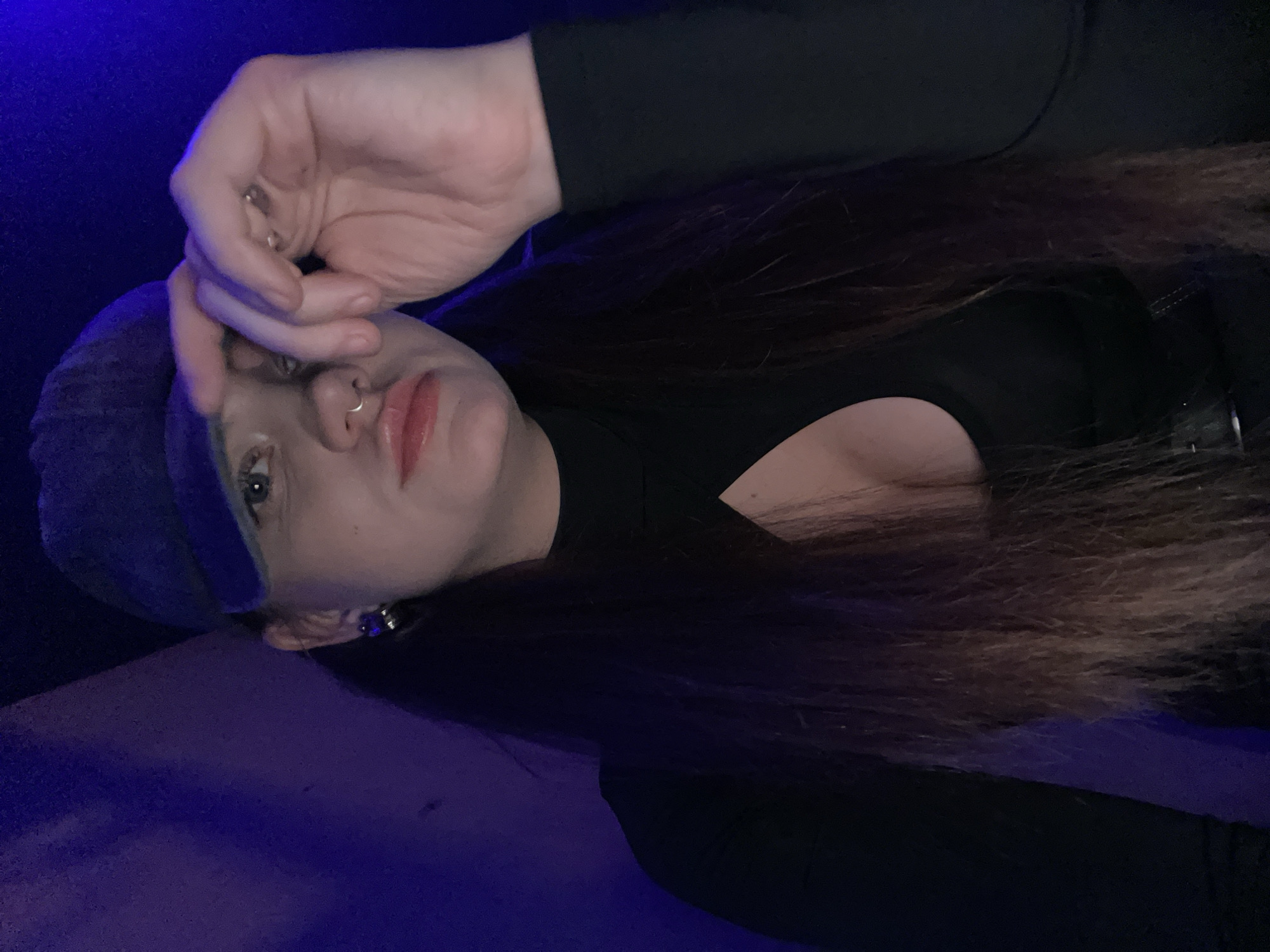 A female subject is depicted in a close-up, selfie-style photograph, taken in a dimly lit indoor environment with a distinct blue-purple ambient light source illuminating the left side of the frame
