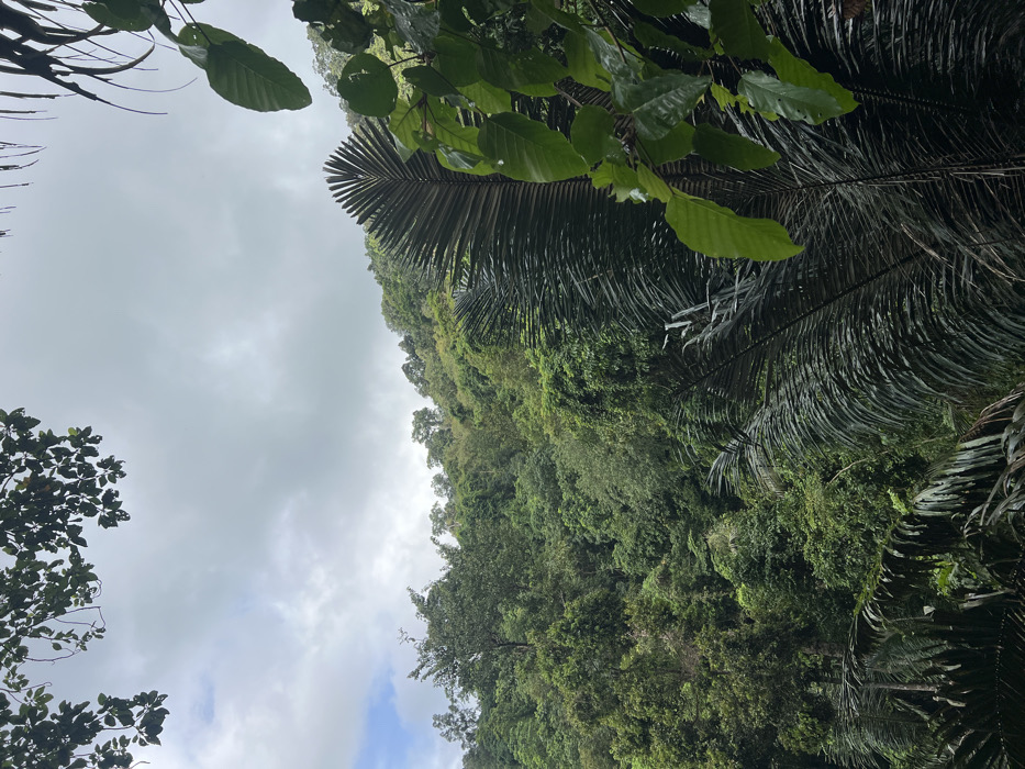 A sky filled with a gray overcast peers down into a dense, lush jungle