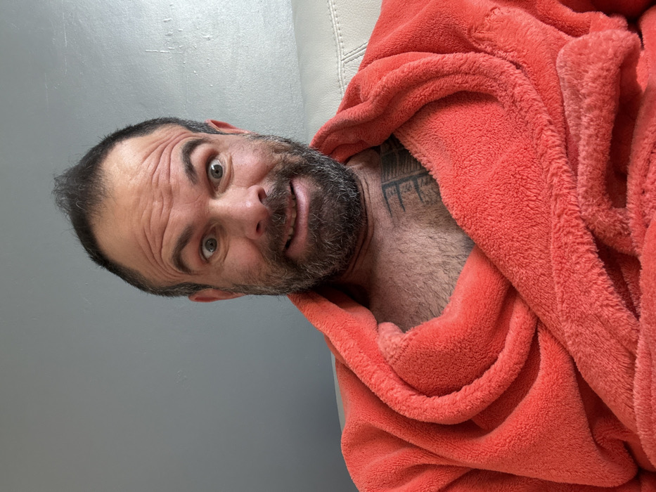 This scene, located in Marche-en-Famenne, Belgium, features a close-up portrait of a single adult male. He possesses a light complexion, a dark and graying full beard, and short, dark hair styled into a pronounced central spike. The individual is wearing a coral-colored, plush bathrobe, which is open at the chest, revealing dark chest hair and a dark-ink tattoo on his upper left pectoral area. His facial expression is marked by wide-open eyes with dilated pupils, a visibly furrowed forehead, and an exaggerated grimace/smile with his teeth exposed. The man is looking directly at the camera. The background comprises a plain light gray wall, with a segment of a light-colored, possibly white, upholstered furniture item visible on the right side of the frame.