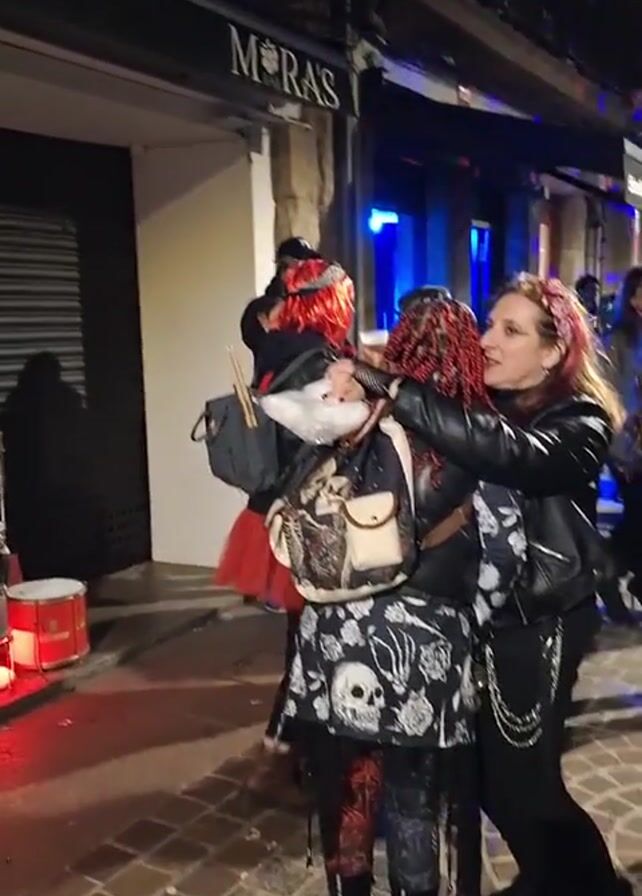 group of people gathered on a brick-paved street at night. They are dressed in various styles, some with punk or gothic elements like leather jackets, skull-patterned skirts, and colorful hair. A woman in a leather jacket adjusts the mask on another person with bright red dreadlocks. There is a band or performance setup nearby, with metal drums and lights. Other people are walking or talking in the background. The scene appears to be in a commercial area, with shops and restaurants visible along the street. There are also holiday lights and decorations adding to the atmosphere.