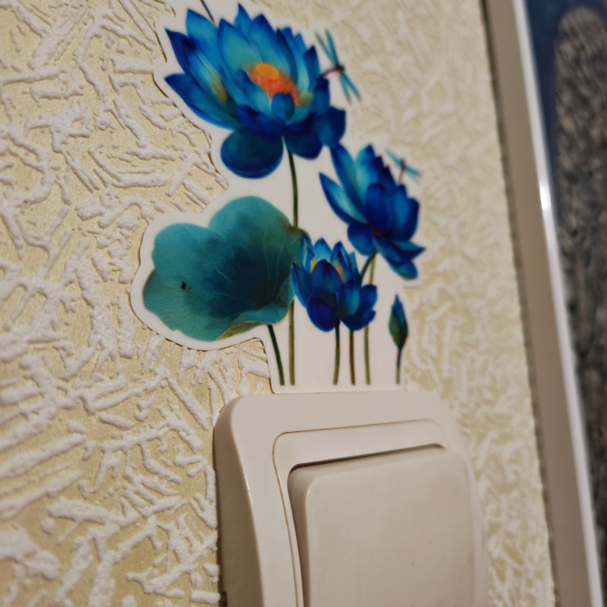 A close-up, slightly angled shot focuses on a light switch cover on a textured, light yellow wall. A sticker depicting blue lotus flowers and dragonflies is positioned above the light switch, partially obscuring it. A portion of a framed picture can be seen on the right side of the frame. The location is Rostov, Russia.