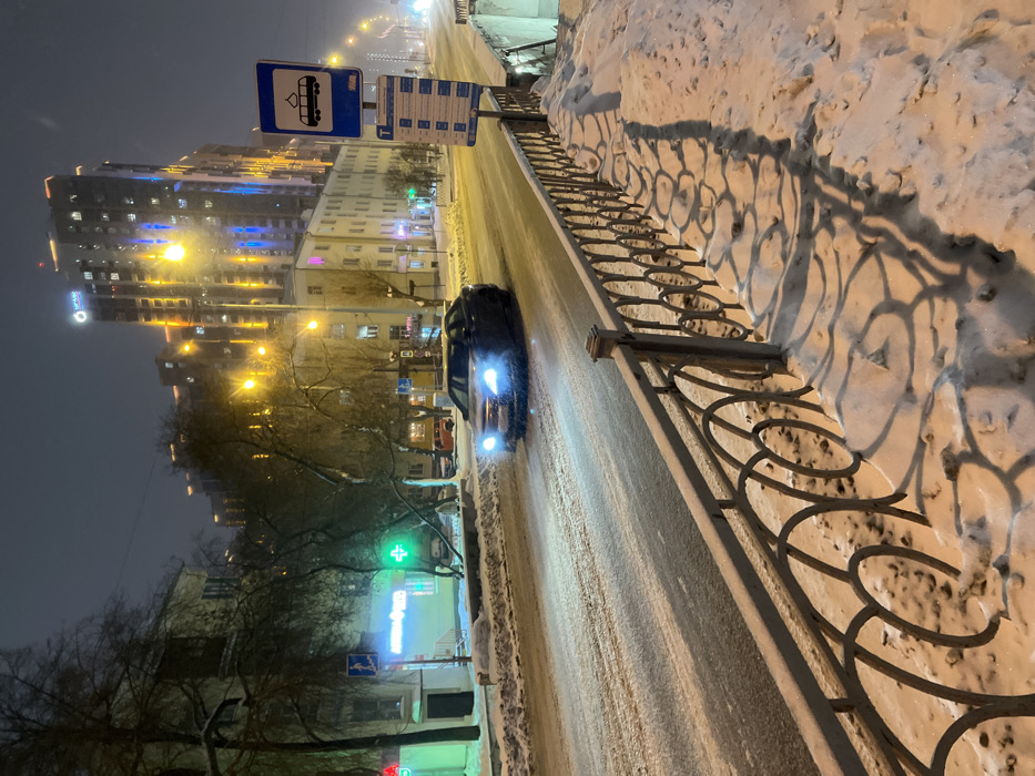 A night scene reveals a snow-covered city street. A dark car with headlights on is driving down the right side. A decorative metal fence lines the sidewalk. Buildings with illuminated windows rise on the left, with a bus stop sign above. Bare trees punctuate the cityscape, and a green pharmacy sign glows. Snow blankets the ground and fence, highlighting the contrast with the dark road. Streetlights cast a warm glow on the scene.
