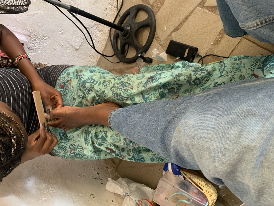 An overhead view captures an indoor scene in Jos, Nigeria, depicting a pedicure service