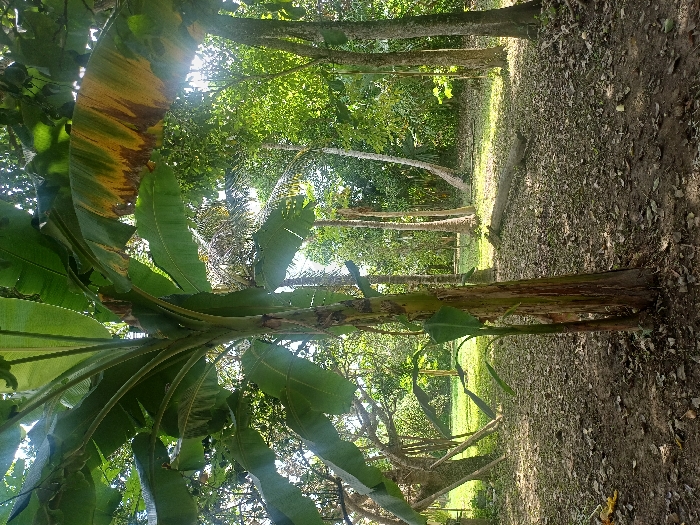 The scene depicts a vegetated outdoor area in Cotorra, Colombia. A large banana plant (Musa species) is centrally positioned in the foreground and mid-ground, exhibiting multiple broad green leaves. One prominent leaf in the upper right quadrant displays significant yellowing and browning. Smaller banana plant offshoots are visible at the base of the main plant's pseudostem. The ground consists of dark soil, heavily covered with a dense layer of dry, fallen leaves and organic debris. In the mid-ground, a horizontal fallen tree trunk or large branch rests on the ground. The background is composed of numerous trees, including several tall, slender trunks resembling palm trees, and other broadleaf species with lush green foliage. Strong sunlight penetrates the tree canopy from the upper right, casting bright highlights on the vegetation and ground. No individuals, man-made structures, or explicit actions or interactions are present.