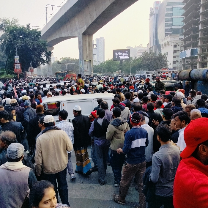- "The image depicts a dense public gathering of hundreds of individuals, primarily adult males, occupying a wide urban street beneath a concrete elevated metro rail viaduct" by FM-rkNqI2, licensed under CC BY 4.0