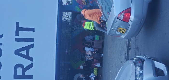 A group of people sit on benches inside an outdoor structure featuring colorful graffiti-style art. A man in an orange shirt and another in a green reflective vest stand behind them, seemingly interacting with the trunk of a silver car parked nearby. Another car is parked in front of the image. A sign is partially visible to the left, with the word "RAIT" displayed in large, blue lettering. The lighting in the image is somewhat dim, and the scene appears to be taken from a slightly elevated position.