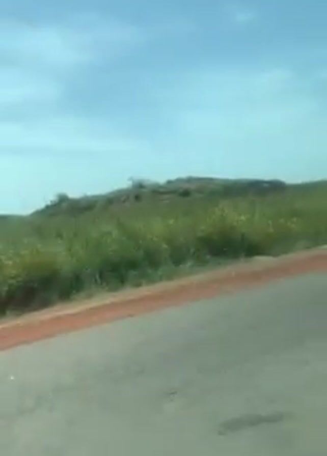 The video depicts a view from a moving vehicle, likely a car, driving on a cracked asphalt road. Beside the road is a grassy, somewhat hilly area with some small rocks and bushes visible. The sky above is light blue with some wispy white clouds. There are no people visible in the frame. The camera appears to be positioned behind the windshield, capturing a blurred view of the car's interior at the bottom of the frame. The primary action is the forward movement of the vehicle.