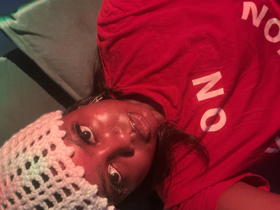 An individual is depicted in a close-up, self-portrait, captured indoors in Badore, Nigeria. The subject is a female, illuminated by a dominant red light source that casts a strong crimson hue across her face and upper torso. She wears a light-colored, open-weave crocheted beanie and a red t-shirt with the white capital letters "ON" visible on the chest area. A small, cross-shaped earring is visible on her left ear. Her dark hair is partially visible beneath the beanie. Her eyes are open, directed towards the camera, and feature prominent eyelashes. Her lips are glossy, and a small piercing is present on her right nostril. The background features a dark, upholstered surface, possibly a cushion or furniture, with subtle hints of green illumination visible in the upper left portion of the frame.