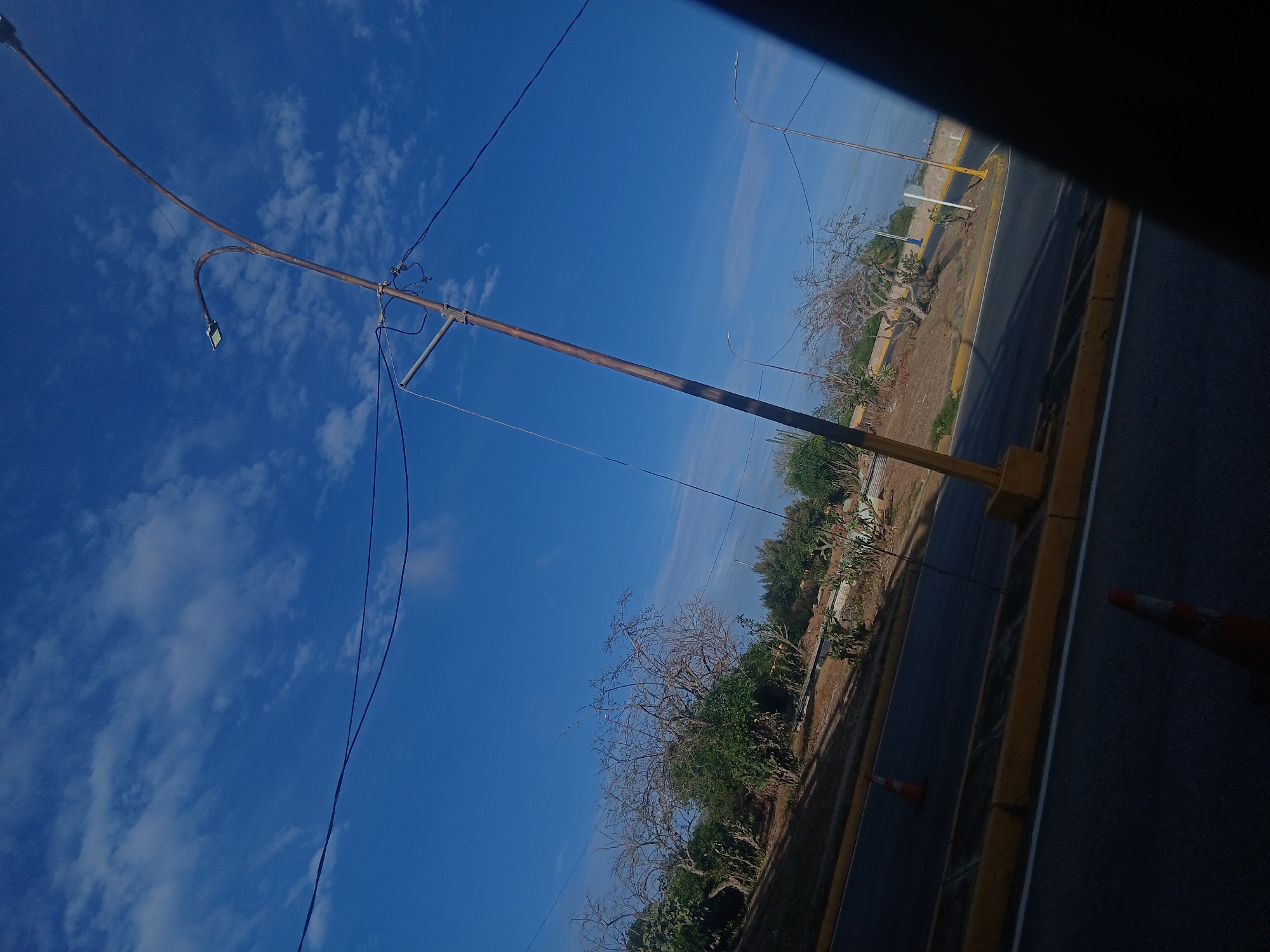 scene in El Valle del Espíritu Santo, Venezuela. The view is from a moving vehicle, looking out a window. The scene includes utility poles, a bright blue sky with some clouds, and a road with yellow markings. There is some vegetation, including trees and shrubs, along the side of the road. Two traffic cones are also visible near the road.