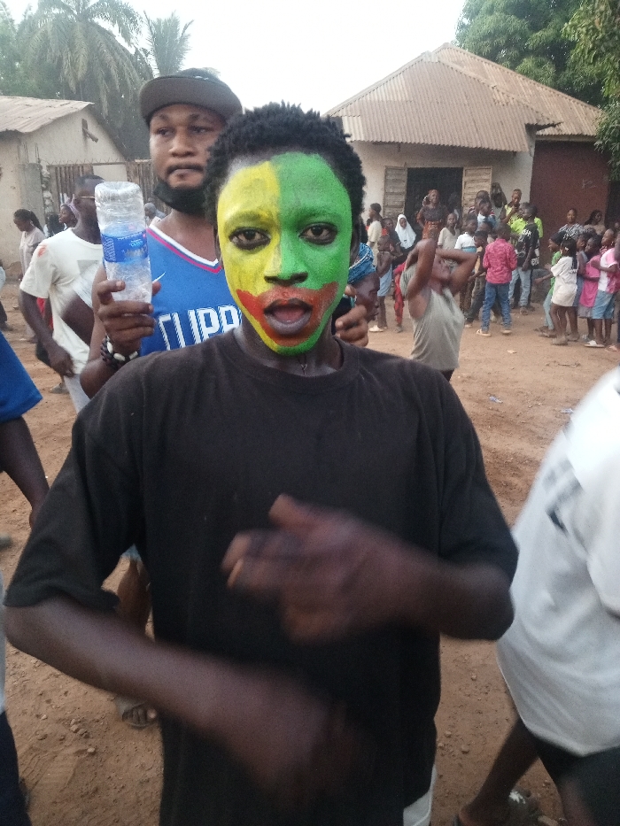 A man in a black t-shirt is posing with green and yellow paint on half of his face, red paint around his mouth. Another man wearing a blue Clippers jersey and a black hat is standing behind him, holding a bottle of water. In the background, a large group of people, mostly children, are gathered near a building with a corrugated metal roof. The scene appears to be outdoors in a village or rural area.