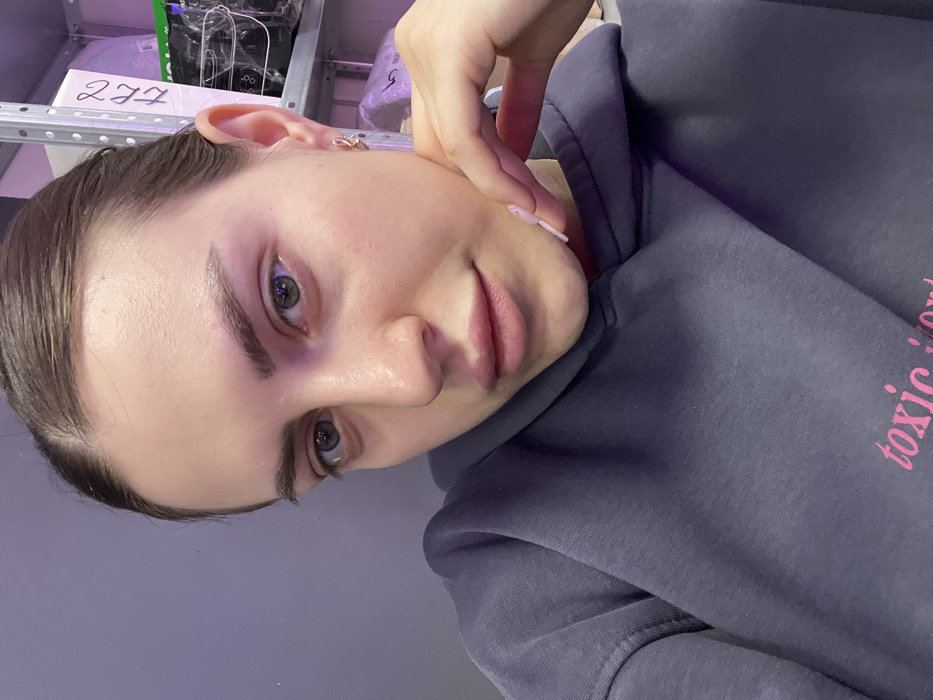 A female individual is depicted indoors in the city of Rostov-on-Don, Russia. The subject, with dark hair pulled back, is shown from the chest up, looking directly into the camera. Her face exhibits a neutral expression, with blue-grey eyes reflecting a purple light source. Her right hand, featuring long, light-colored manicured nails, is positioned under her chin. She is wearing a dark grey hooded sweatshirt with partially visible pink text on the front, reading "toxic". A small, metallic earring is visible on her right earlobe. The background on the left consists of a plain grey wall. On the right, a silver-colored metallic shelving unit is visible, holding various items including a white object with red numerals "222" and other opaque containers and green materials. The scene is illuminated by artificial light, with a distinct purple hue cast upon the subject's right side and the shelving unit.