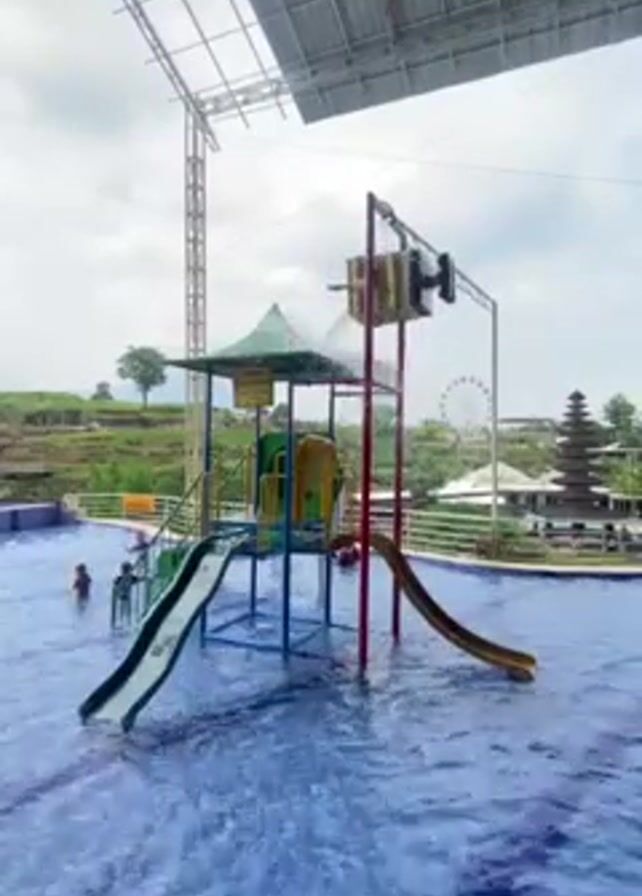 water park scene. At the center of the frame is a children's water play structure with two slides and a large tipping bucket. The bucket empties, creating a splash. Children are seen playing around the structure. The pool water is blue and rippled. In the background, there are green hills, a white fence, and a tall tower that resembles a pagoda. The sky is overcast. A steel structure, possibly a roof support, is visible overhead. The overall setting appears to be an outdoor recreational area.