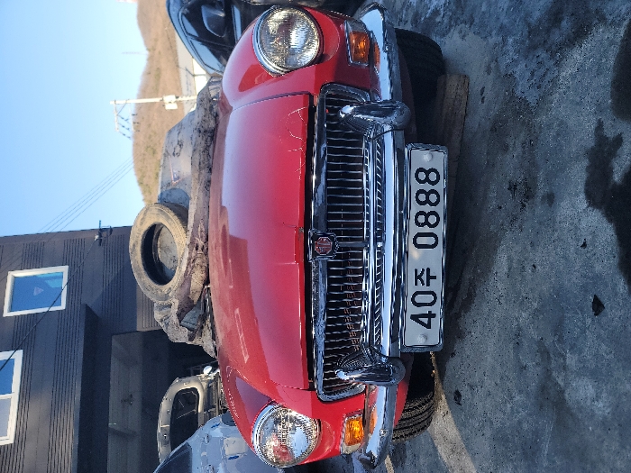 A red, vintage MGB roadster faces the camera. It has a chrome grill and bumper with round headlights. A South Korean license plate reads "40 주 0888" vertically. The car appears to be parked outside on concrete. In the background is a dark building, a tire on an object, and hills. The photo has been rotated ninety degrees.