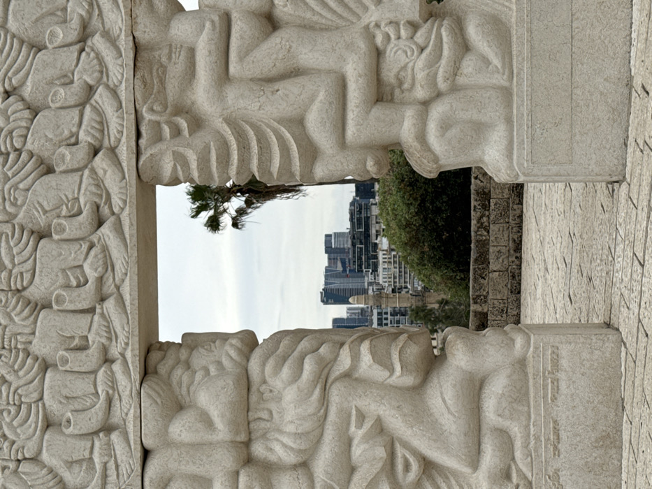 The image displays a view through an ancient-looking, light-colored carved stone archway located in Abrasha Park (Gan Abrasha) in Old Jaffa, Tel Aviv, Israel. The archway itself is profusely decorated with bas-relief carvings depicting numerous stylized, intertwined anthropomorphic figures across its pillars and lintel, suggesting a mythical or symbolic narrative. The stone exhibits a pale, creamy-grey hue with visible texture and some wear. The ground in the foreground and beneath the arch is paved with irregularly shaped, light-toned stone blocks. Through the archway, a vista of modern Tel Aviv is visible under an overcast, light-grey sky. A dark green palm tree, with some dry fronds, stands prominently to the right, framed by the arch. Below it, dense green foliage is present. To the left, a tall, slender minaret with a conical cap rises above mid-rise buildings, indicating a mosque in the Old Jaffa area. Beyond this, the contemporary skyline of Tel Aviv features multiple high-rise buildings, constructed from glass and various light-colored materials, some with distinctive architectural shapes. The lighting is soft and diffused. No individuals are visible within the frame.