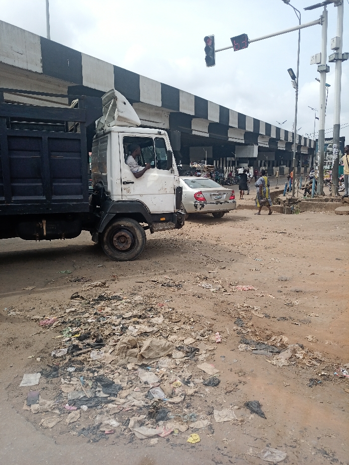 The image depicts an outdoor urban scene in Nkpor, Nigeria, characterized by an overpass and vehicular/pedestrian traffic