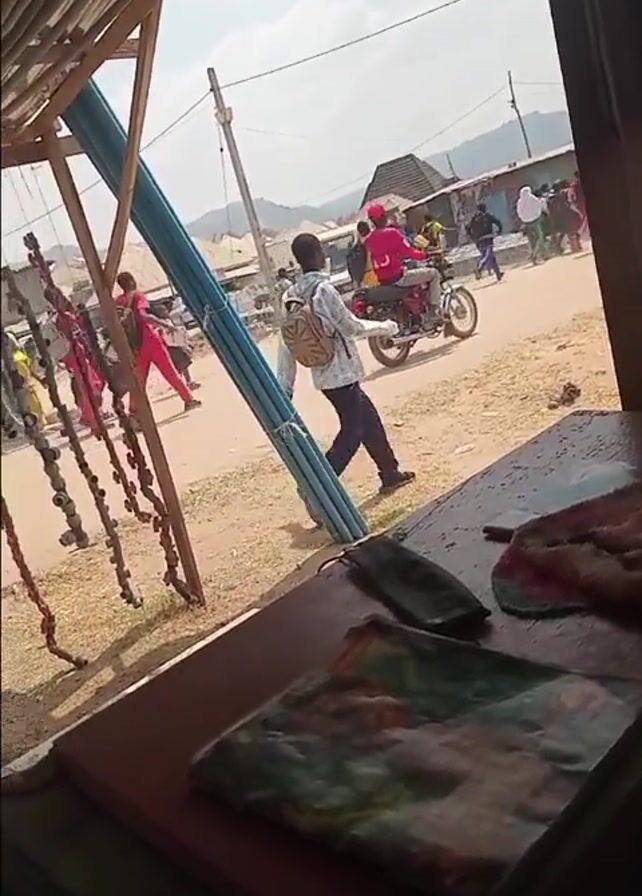 The video, shot from inside a building, shows a crowd of people gathered outside on a sunny day. Many people are running. The people are wearing a variety of clothing including school uniforms and brightly colored outfits. A motorcycle with two passengers is also present. In the foreground, inside the building, is a wooden table with a face mask and what appears to be a book or stack of papers. The building appears to be a simple structure with a corrugated metal roof. A set of what appear to be decorations, hanging from the structure, swings in the breeze. In the distance, mountains are visible. The overall atmosphere is one of commotion and possibly alarm.