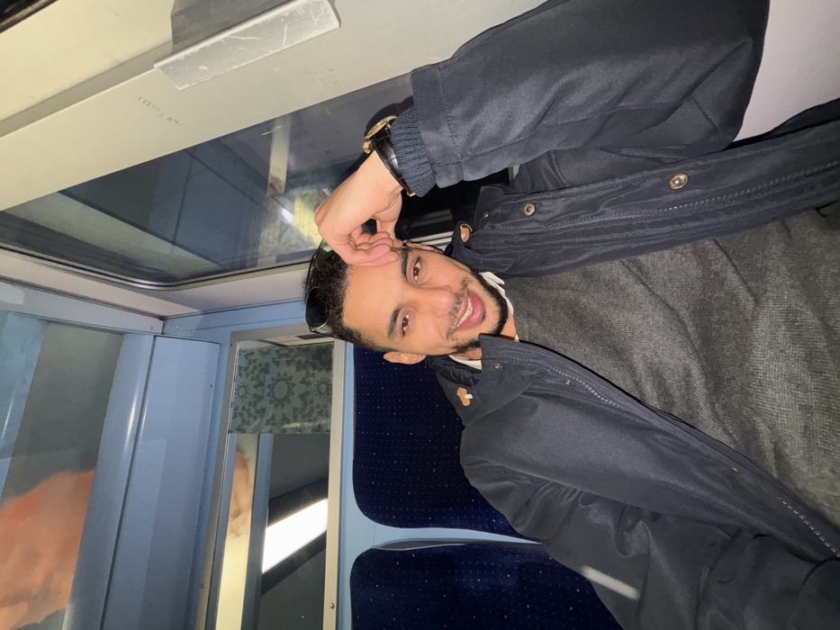 The scene depicts an adult male seated inside a train carriage. The interior of the train features light blue paneling, blue upholstered seats with a speckled pattern, and elongated white ceiling lights. Through the window to the man's left, reflections are visible, including a recurring abstract geometric pattern on a light background, and blurred external elements suggesting movement. This train carriage is located in Morocco, contextually linked to the Sidi Slimane area. The man, positioned centrally in the frame, has dark hair, a short beard, and is smiling broadly with his teeth visible as he looks directly at the camera. He wears dark sunglasses pushed onto his head. His attire consists of a dark navy blue zippered jacket over a charcoal grey long-sleeved sweater. On his left wrist, he wears a watch with a dark strap and a gold-colored bezel. His left hand is raised, with fingers lightly touching his forehead or hairline. His right arm is partially visible, resting in his lap.