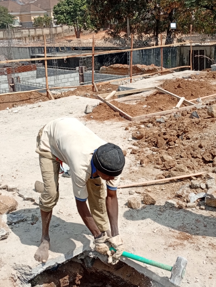 The image depicts an outdoor construction site in Abuja, Nigeria, under bright daylight