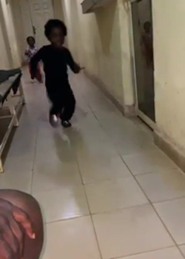 two young children running down a hallway with light beige-colored tiled flooring. The first child, dressed in a black long-sleeved outfit and silver shoes, runs towards the camera. Behind them follows a second child wearing a long-sleeved floral shirt and red pants. The hallway is painted a light yellowish-beige color with a doorway visible at the end of the hallway and a window with a silver frame to the right. The bottom of the frame shows a knee and hand in the lower left portion of the screen, indicating the videographer's presence. The children appear to be playing, laughing, and running in an energetic manner.