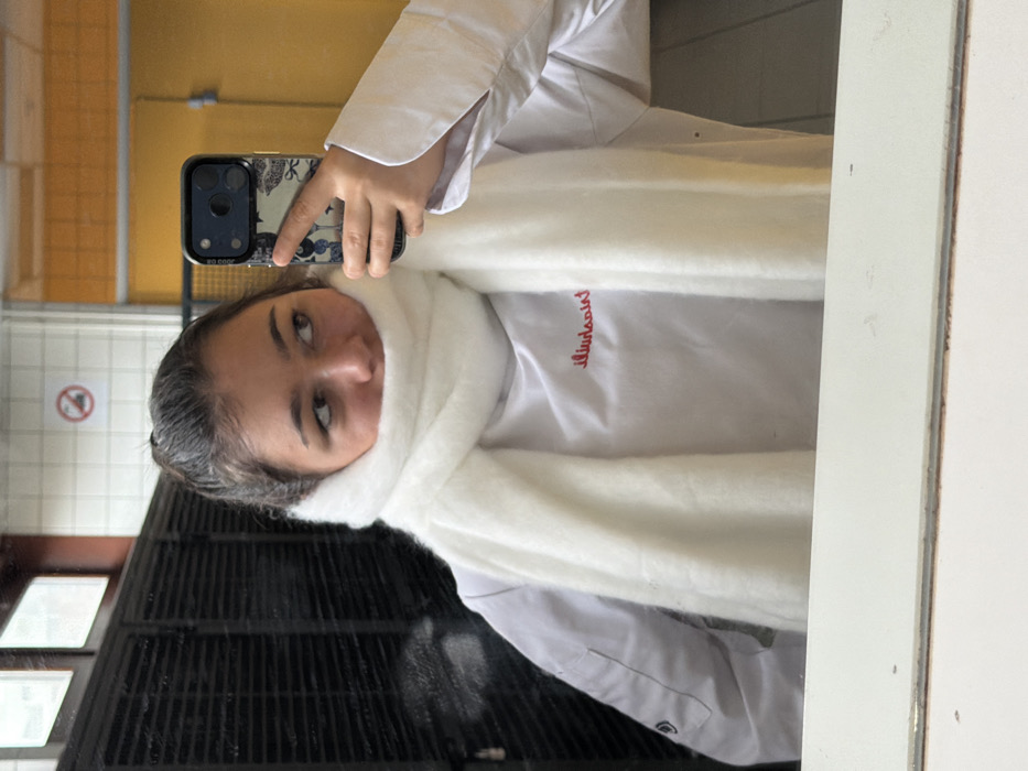 A young individual, appearing female, with dark hair pulled back, is reflected in a mirror while taking a selfie. She is dressed in a white chef's jacket (veste de cuisine), which features red embroidered text on the chest, appearing as "Molécul'air" or a similar brand/establishment name when viewed correctly. A voluminous, fluffy white scarf is wrapped around her neck, covering her lower face. Her gaze is directed towards the upper right of the frame, away from the camera. Her right hand holds a smartphone, encased in a black and white patterned protective cover, positioned to capture her reflection. The background, visible in the mirror, includes a dark, slatted surface on the left, possibly lockers, with two rectangular windows above it. To the upper right, a light-tiled wall displays a red circular prohibition sign. A bright yellow wall or door is visible further right. The immediate foreground consists of a white counter or ledge. The scene is situated within the city of Schiltigheim, France, likely in an institutional kitchen, changing room, or culinary work area.