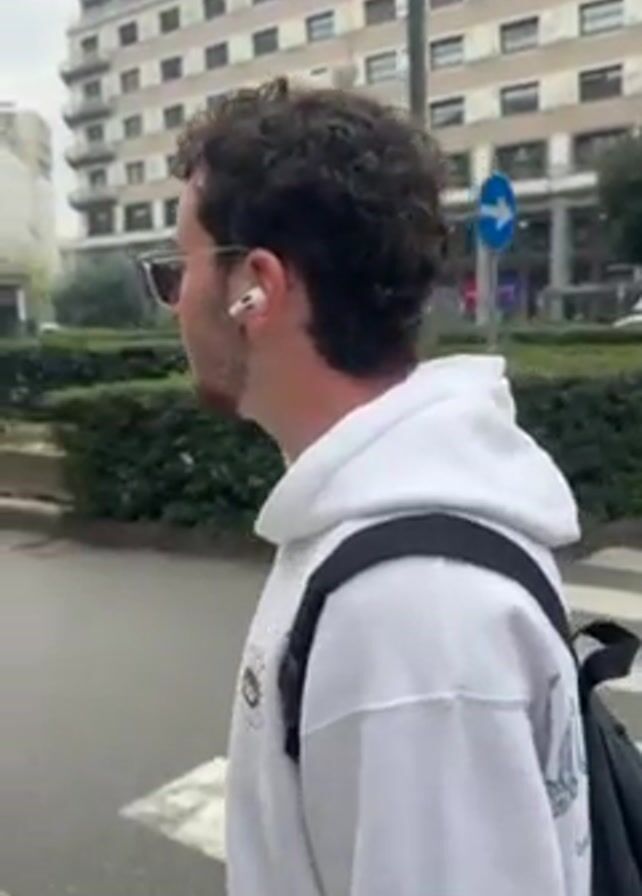 A man with curly dark hair and a beard, wearing sunglasses and a white hoodie, is walking on a zebra crossing in a city. He has earbuds in his ears and a black backpack. The background includes buildings and greenery. The camera then pans to a red Ferrari parked on the side of the street. A bus and other cars are visible in the background. The man then turns towards the camera and smiles, with the red Ferrari in the background.