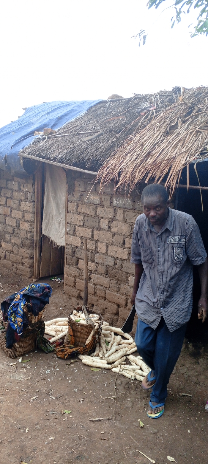 This image depicts an outdoor scene in Abengwa, Democratic Republic of the Congo, featuring an adult male near a rudimentary dwelling and a substantial quantity of root vegetables