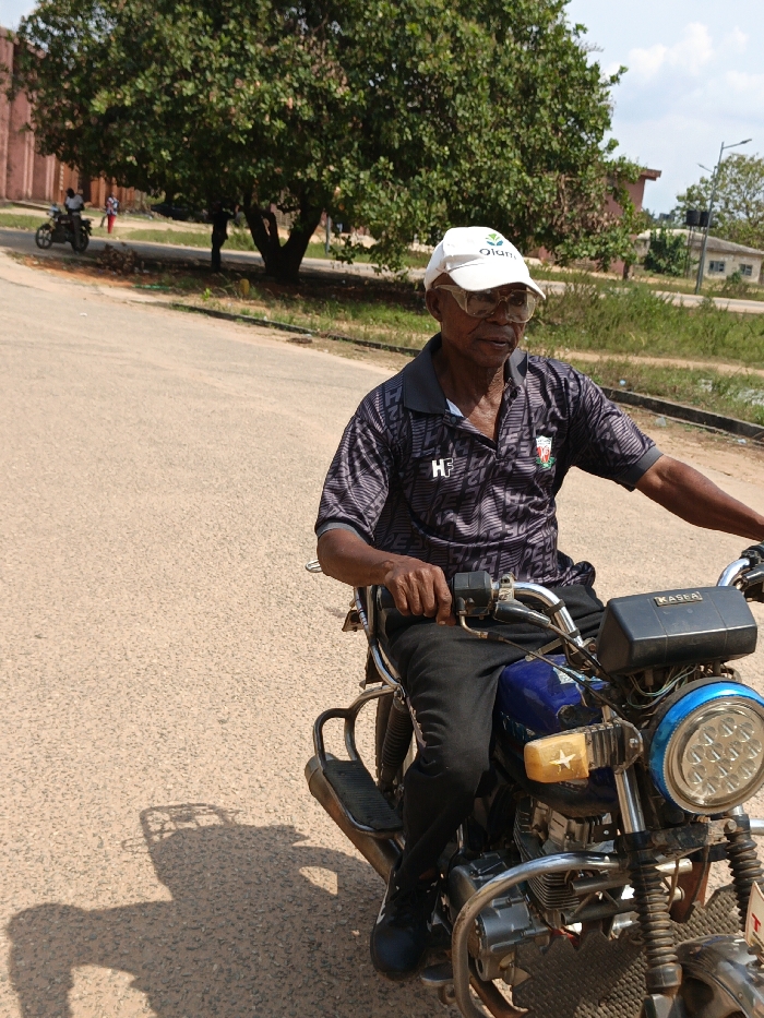 An older Black male is seated on a motorcycle on a paved road in Ihiagwa, Nigeria