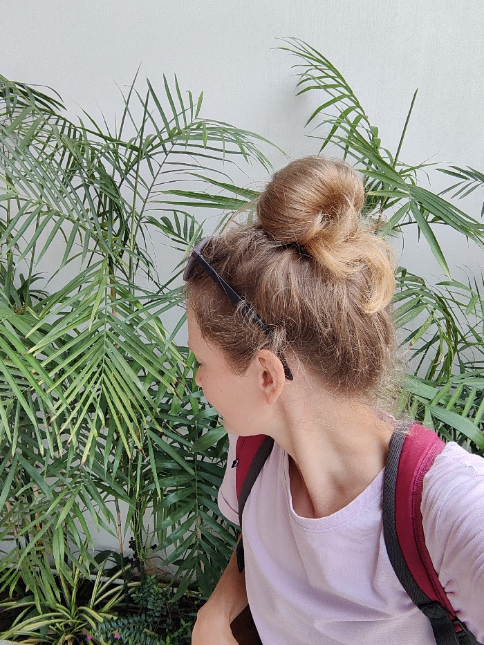 A female subject is depicted from the upper back to the mid-torso, positioned outdoors in Vỹ Dạ Ward, Vietnam. Her light brown hair is gathered into a high bun, with black-framed sunglasses resting on top of her head. She is wearing a light purple crew-neck t-shirt and a red and gray backpack over both shoulders. The subject's head is turned to her left, revealing her right ear and the right side of her neck. In the background, lush green foliage, primarily palm fronds, is visible against a plain white wall.