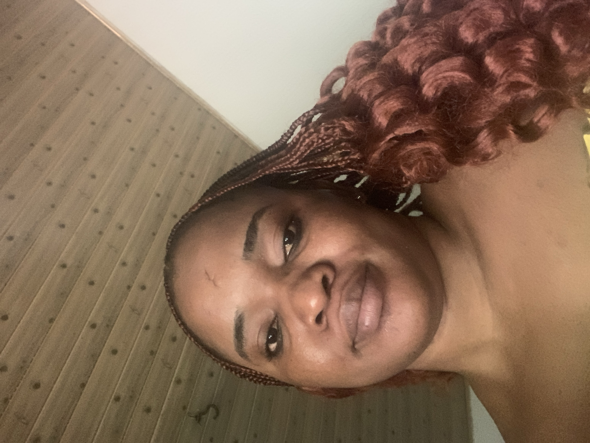 A close-up, indoor shot of a woman with brown braided hair, possibly extensions, and reddish-brown curly hair