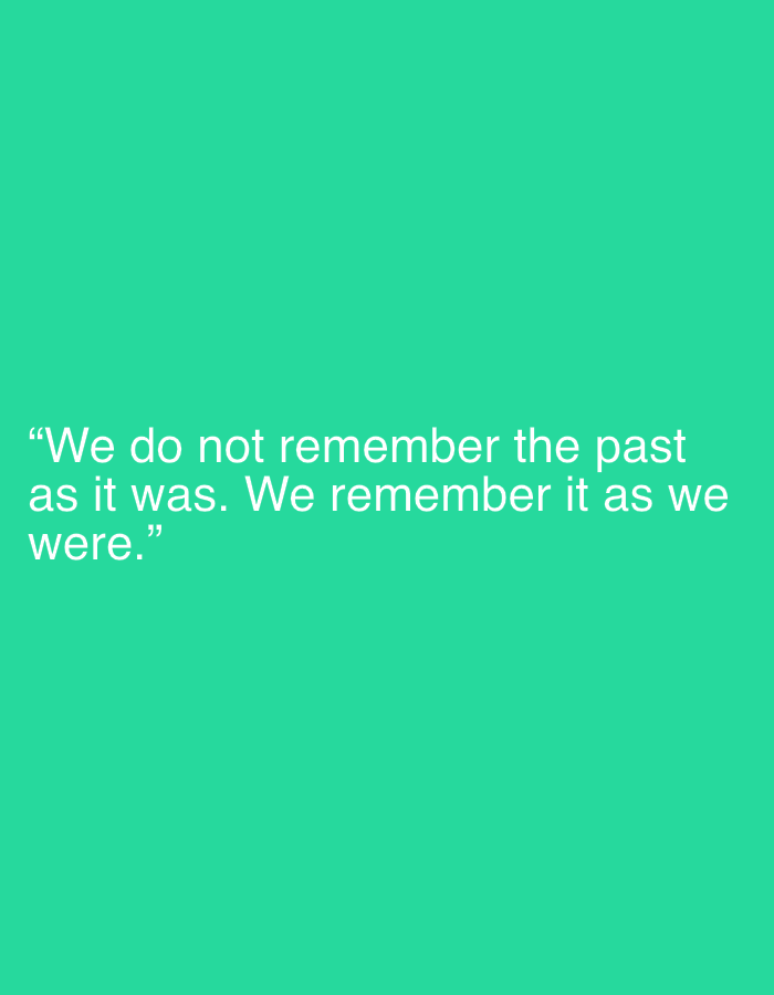 The image displays a solid, monochromatic teal background. White text, enclosed in quotation marks, is centered on the lower half of the frame. The text reads: "We do not remember the past as it was. We remember it as we were." No people, subjects, objects, or actions are depicted within the image. The environment is a flat color field. The visual data within this image does not provide any information regarding a specific geographical location, including the city of Teteven, Bulgaria.