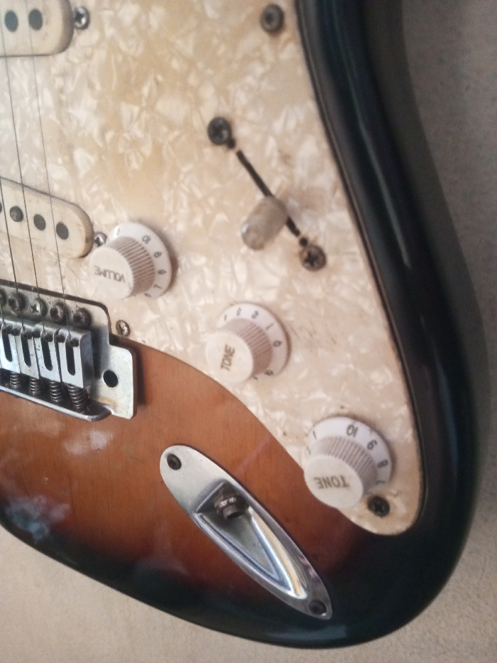 - "A close-up shot reveals the body of a well-worn sunburst electric guitar" by FM-2qiQn2, licensed under CC BY 4.0