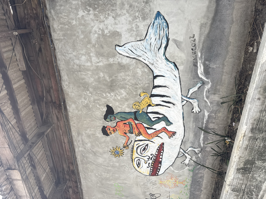 A mural is depicted on a grey, rough-textured concrete wall in Nathon, Thailand