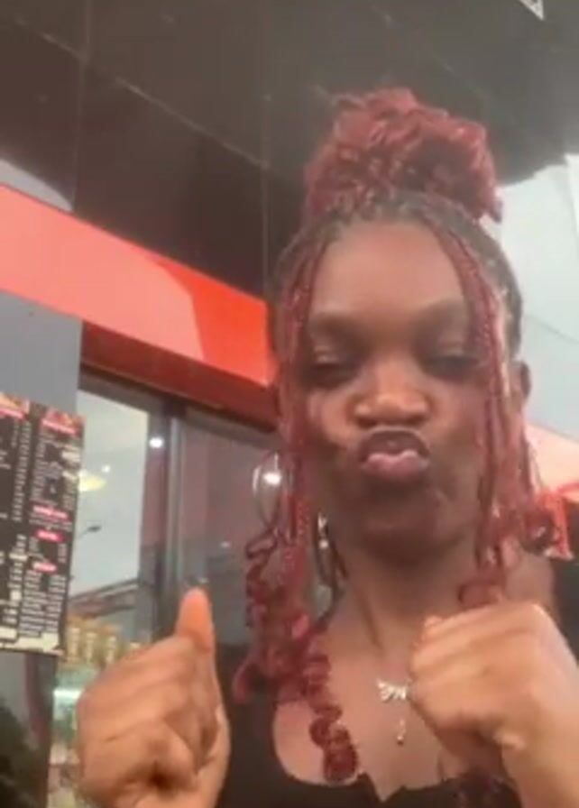 A young, dark-skinned woman with auburn braids and a topknot is standing in front of a take-away shop, facing the camera. She is wearing a black top and a silver necklace. She alternates between making a kissing face, speaking, and clapping her hands. Behind her is a glass window showing the interior of the shop, including a menu board and shelves of beverages. The shopfront is black with a red trim. A logo and a QR code are visible at the top of the frame.