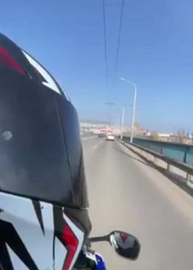 first-person view of someone riding a blue and white motorcycle across a bridge. The rider is wearing a black, white, and red helmet. The bridge has lampposts and overhead power lines. There is a city in the distance. Other cars are visible on the bridge. The sky is blue.